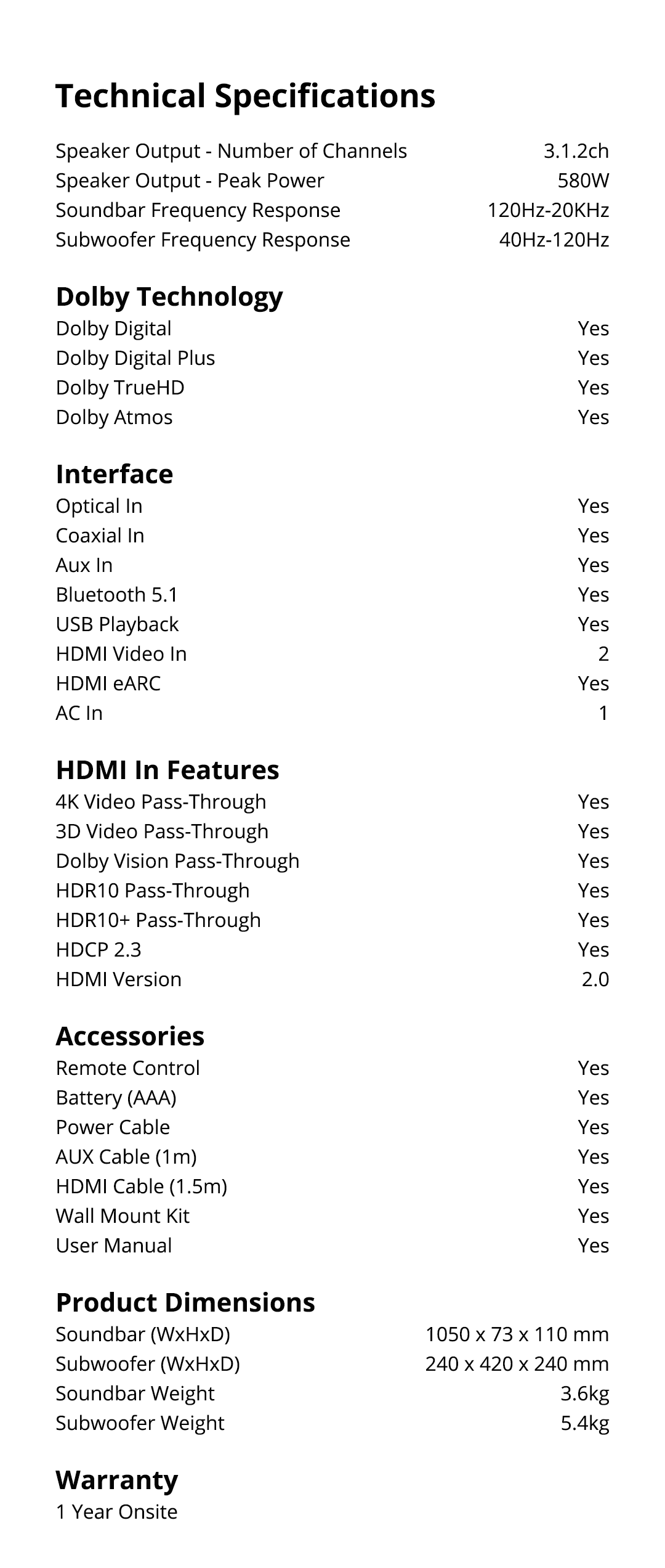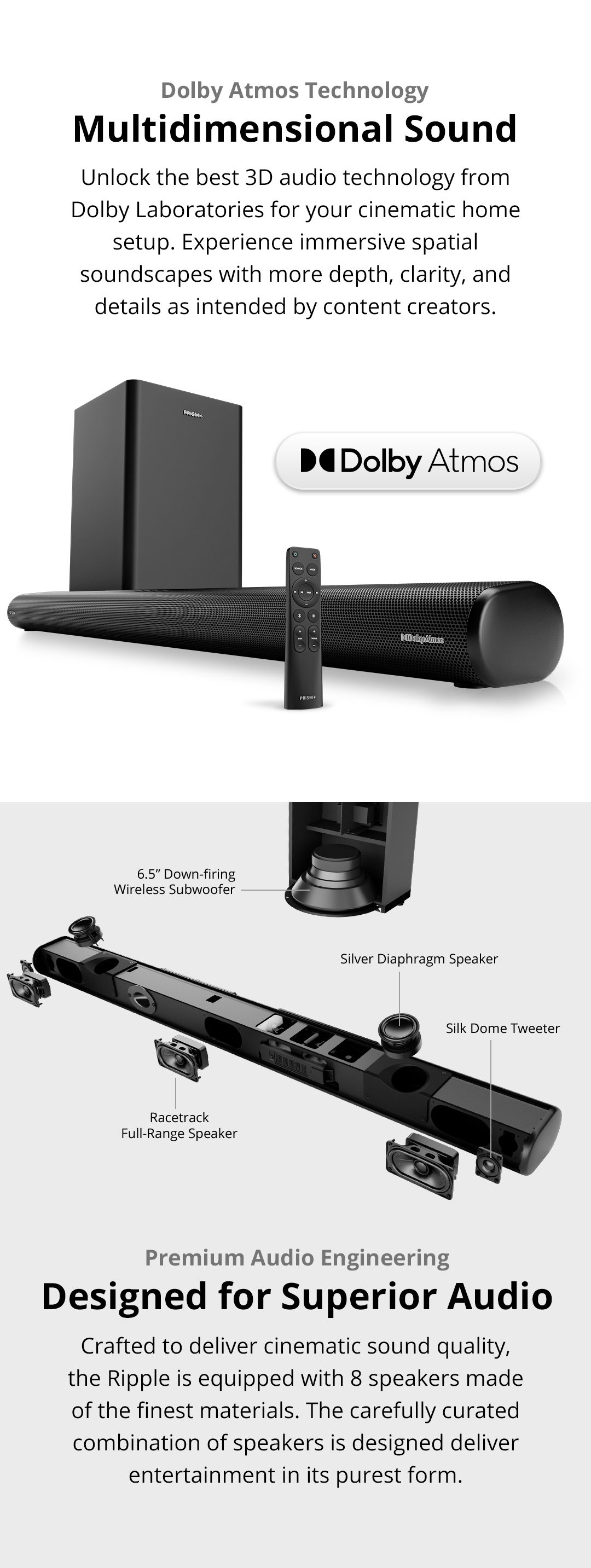 PRISM+Ripple 3.1.2ch带杜比全景声的条形音箱|580W|无线低音炮|无线音乐流|蓝牙5.1